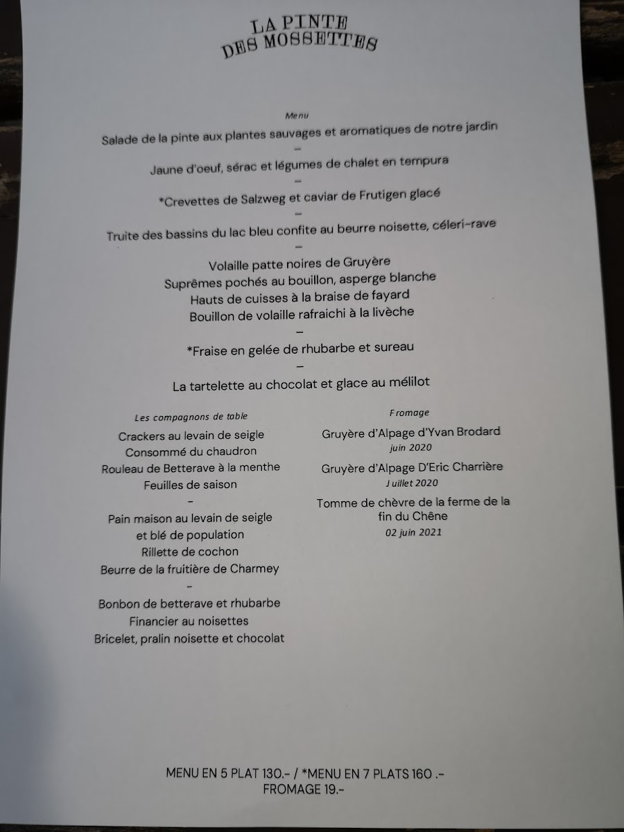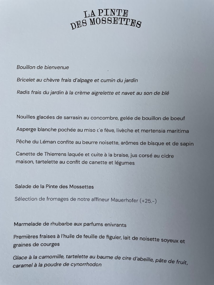 Overall, the menu at La Pinte Des Mossettes beautifully balances both hearty and light options, making it an excellent choice for anyone seeking an authentic Swiss dining experience. Whether you're in the mood for a rich dessert or a savory main course, the restaurant delivers a memorable dining experience with dishes that embody the best of Swiss culinary traditions.